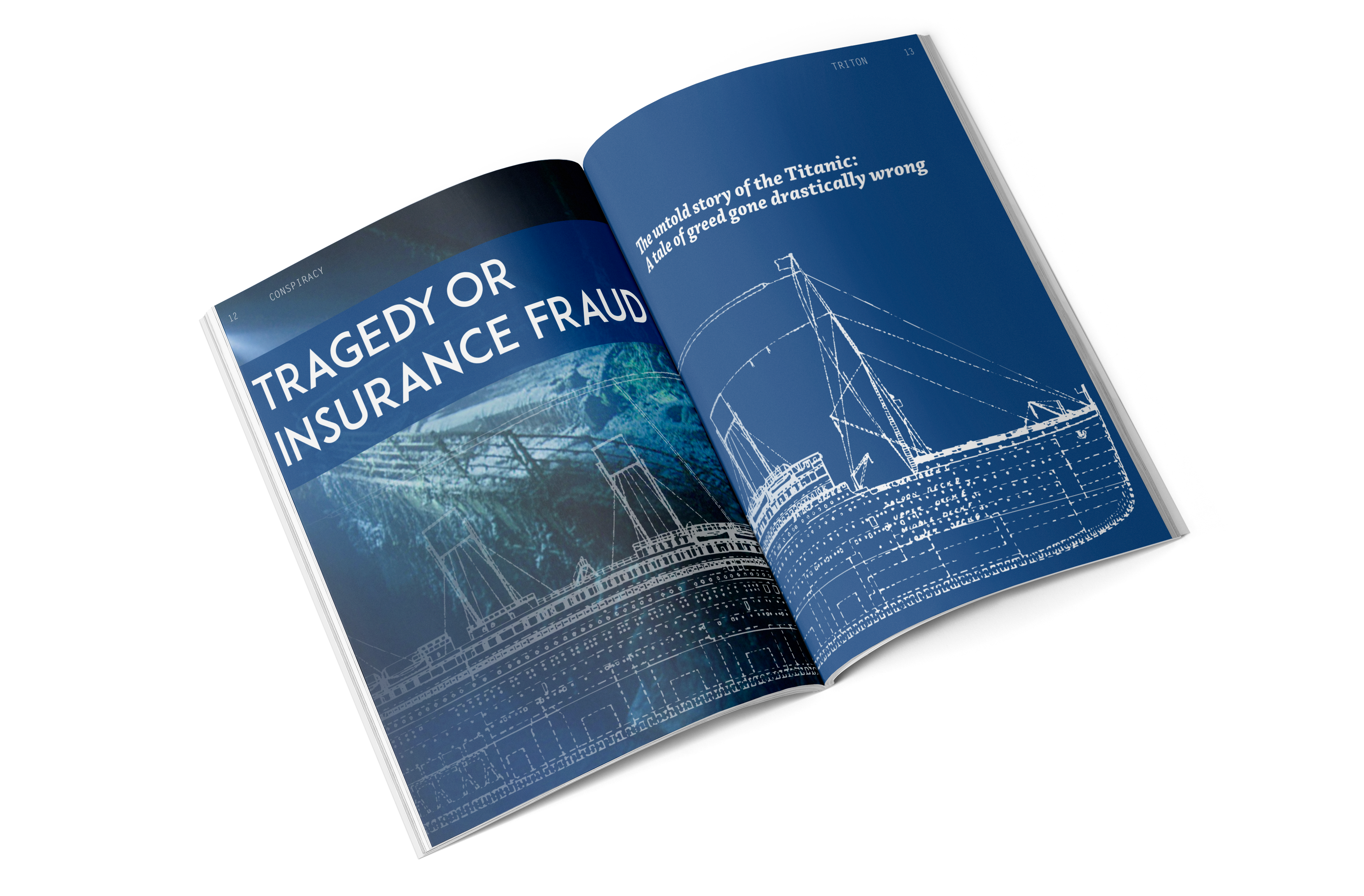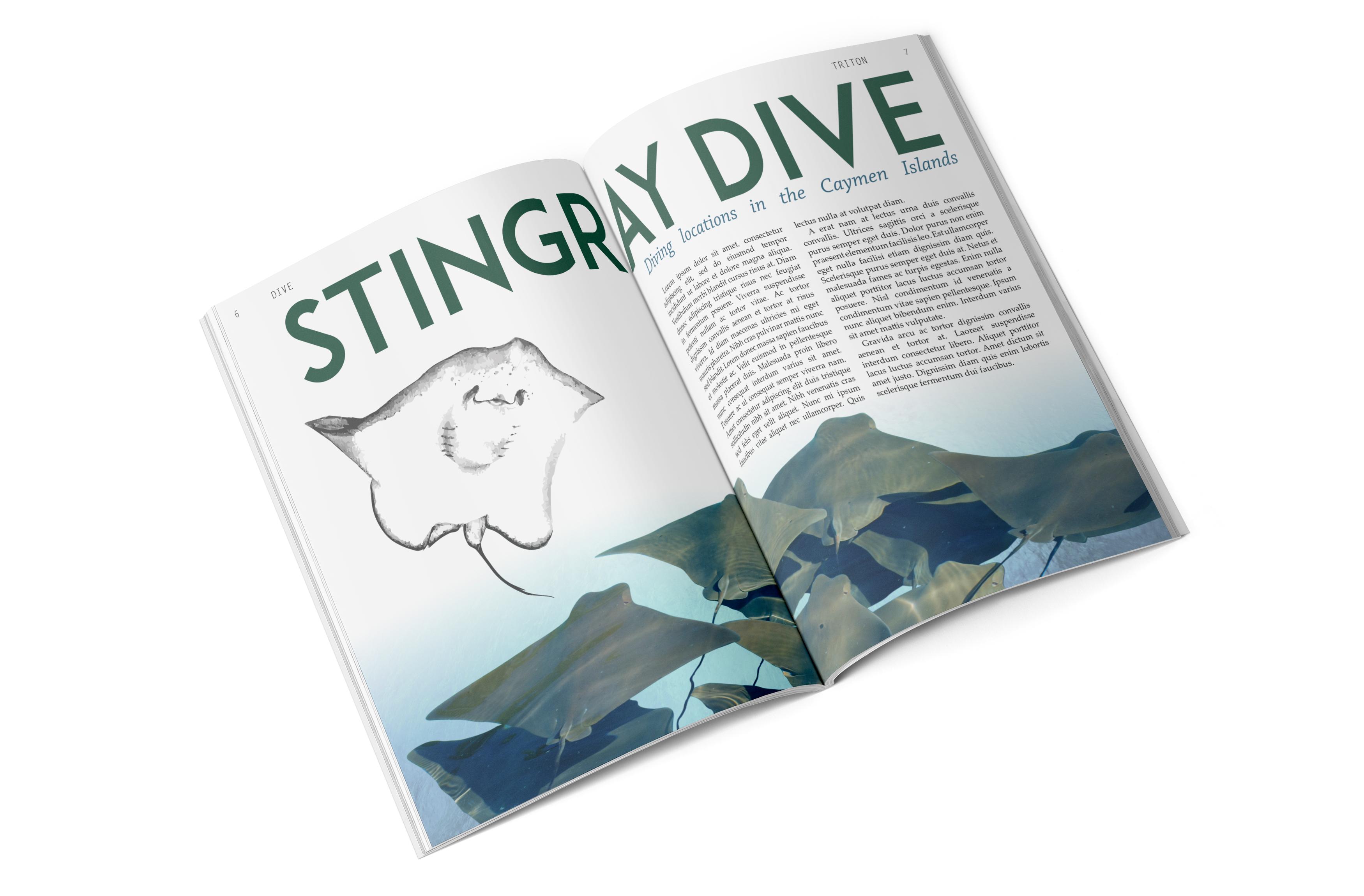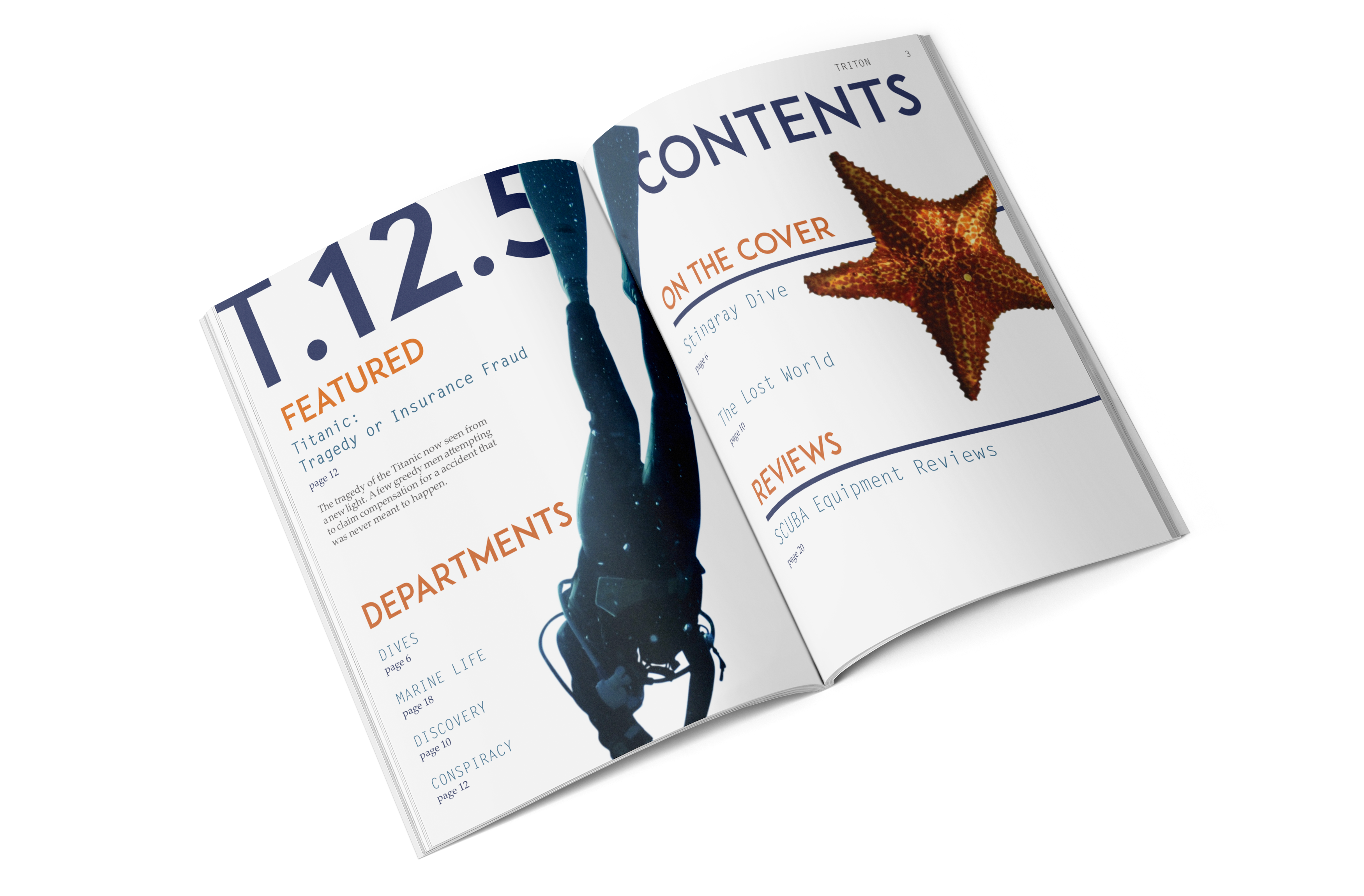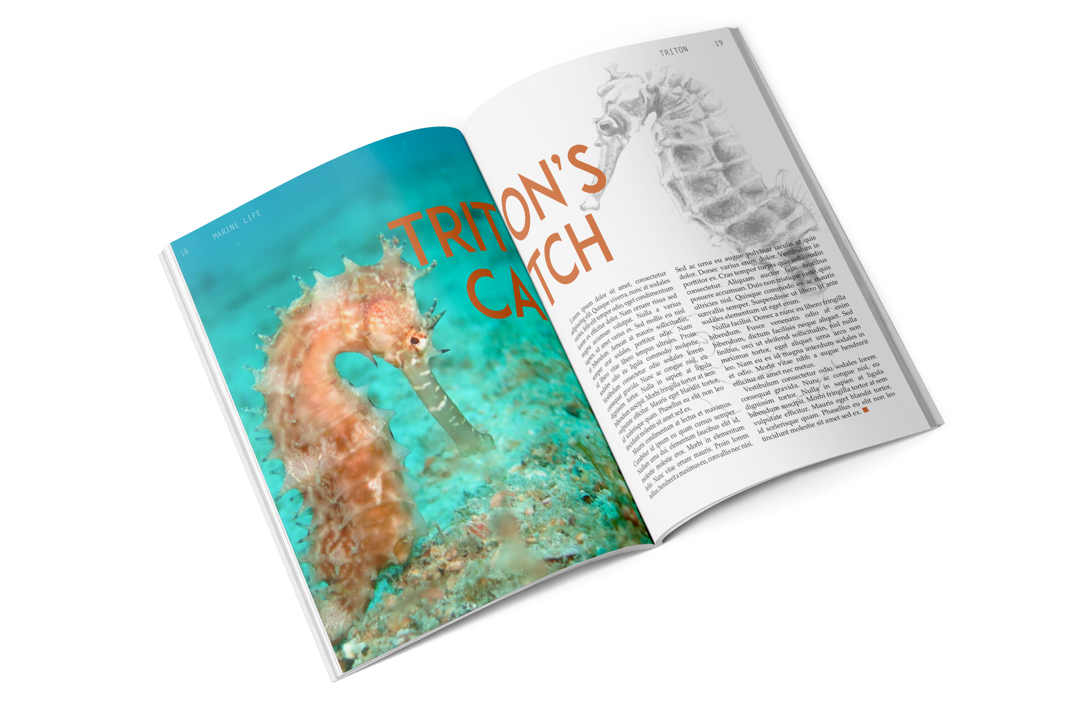 This project’s ask was to produce an entire magazine from scratch, creating branding, tone, style, and the magazine itself. Triton is a magazine focused on the most fascinating parts of the ocean, some only speculation even. It is new and interesting, drawing readers of all ages and backgrounds to dive into its pages to discover the most unusual and unseen parts of the ocean. Described as “Discovery Kids for adults,” it envelopes science and conspiracy through use of hand-drawn illustrations, photography, and engaging layouts.