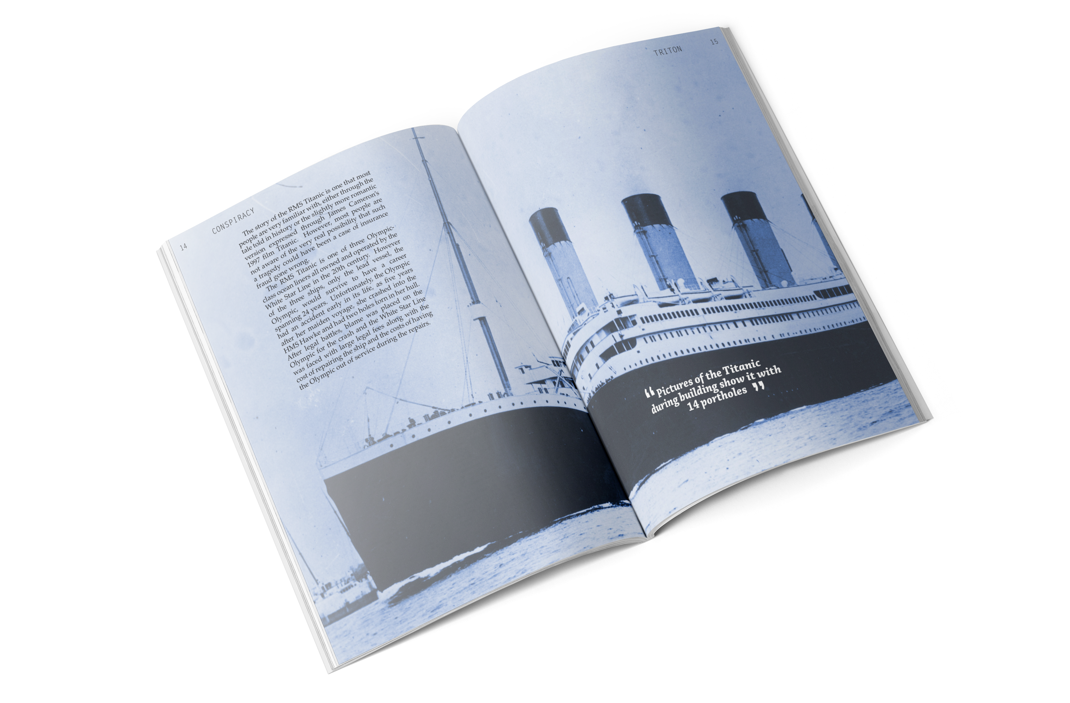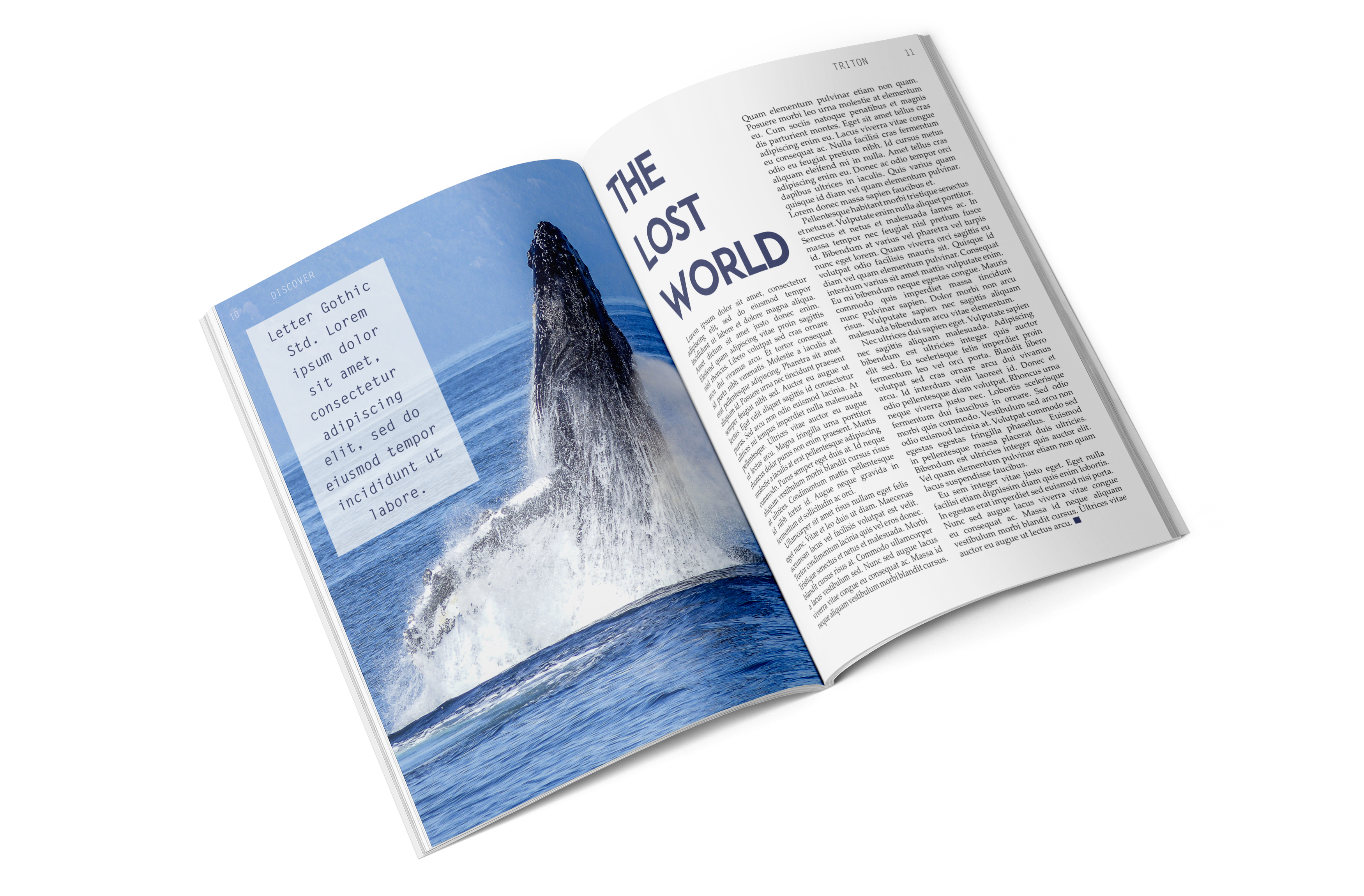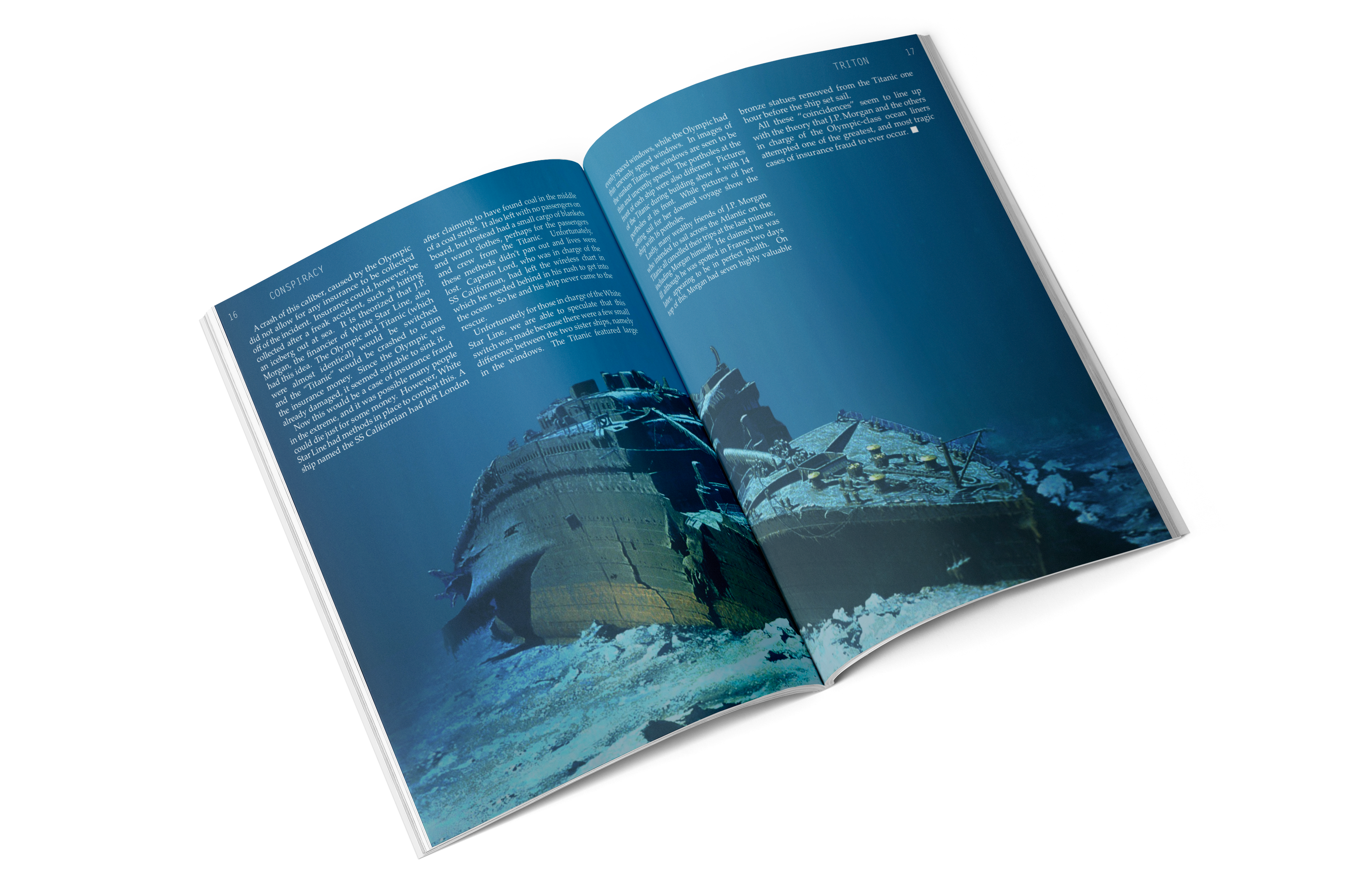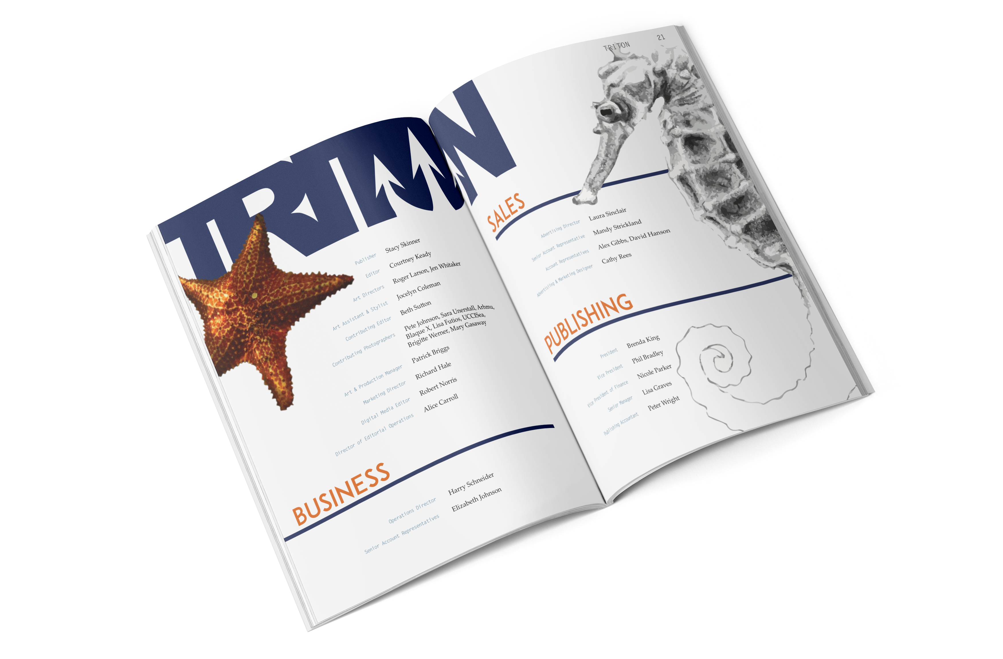 This project’s ask was to produce an entire magazine from scratch, creating branding, tone, style, and the magazine itself. Triton is a magazine focused on the most fascinating parts of the ocean, some only speculation even. It is new and interesting, drawing readers of all ages and backgrounds to dive into its pages to discover the most unusual and unseen parts of the ocean. Described as “Discovery Kids for adults,” it envelopes science and conspiracy through use of hand-drawn illustrations, photography, and engaging layouts.