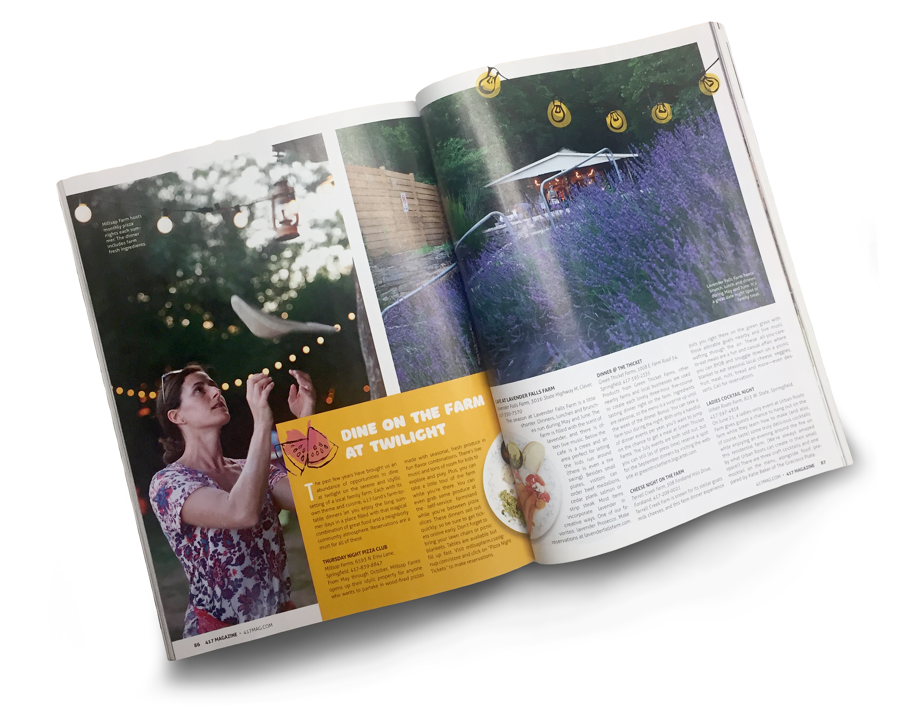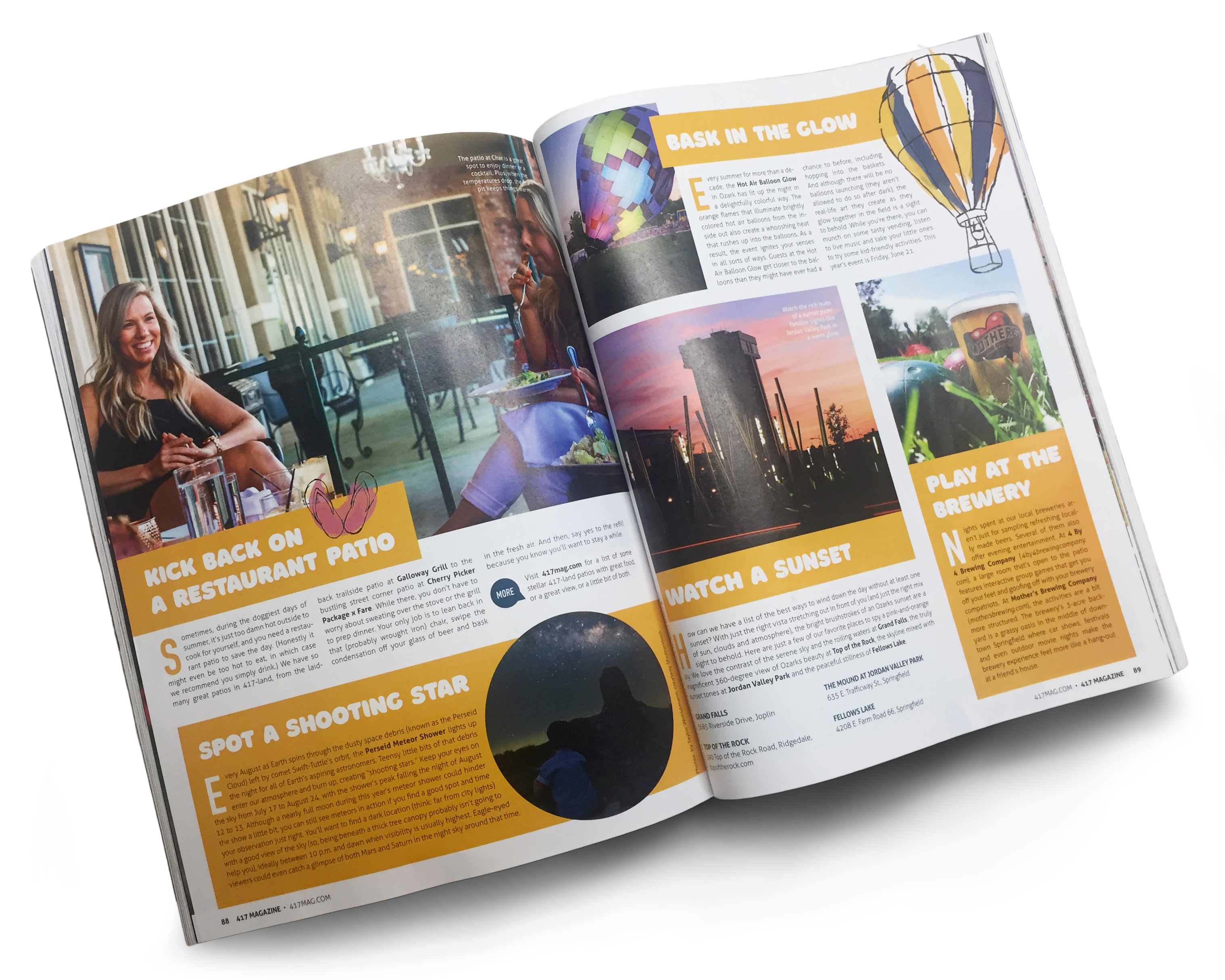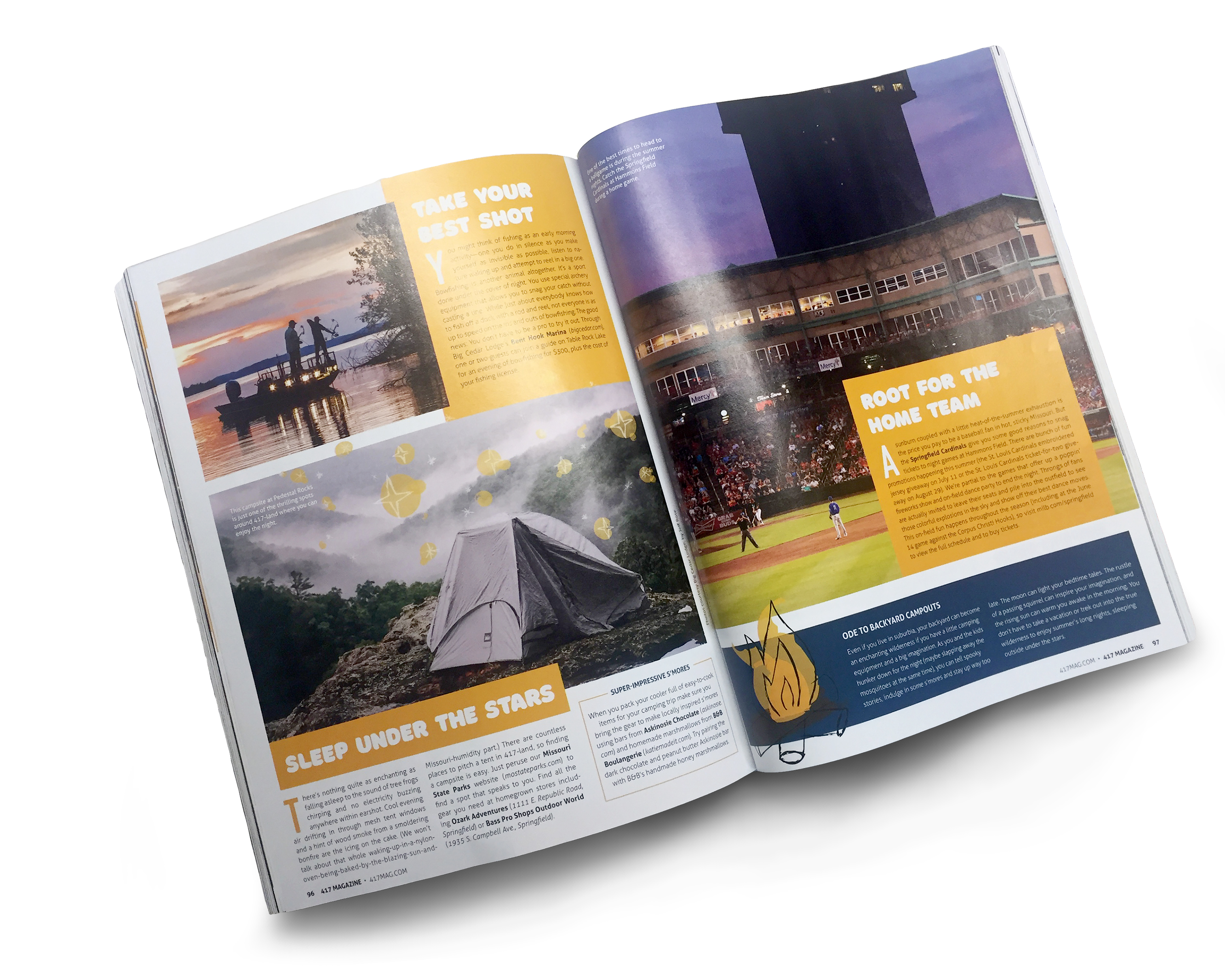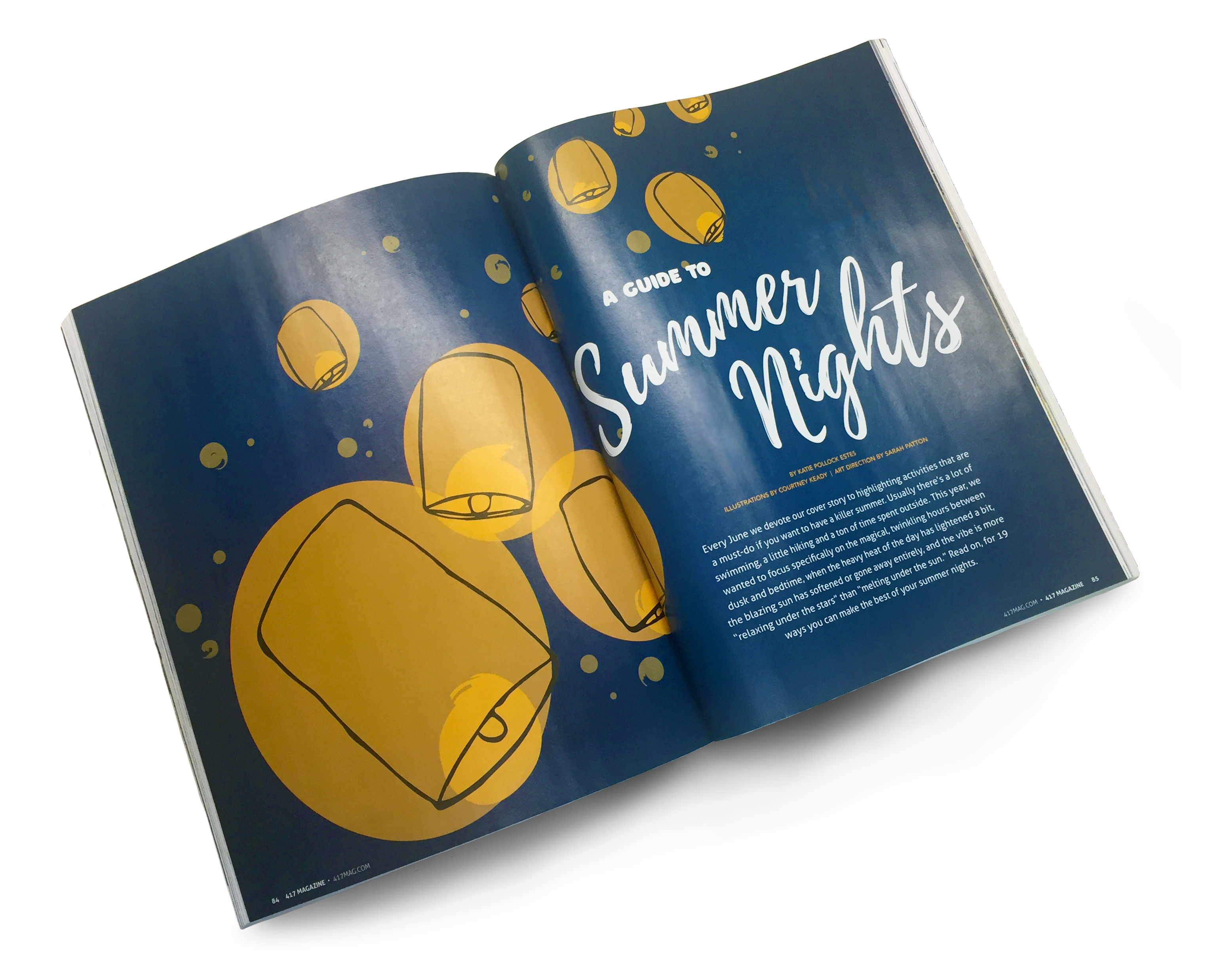 During my internship at 417 Magazine, I produced a series of illustrations for the 2019 June feature “Summer Nights.” I used a watercolor and hand-drawn style to convey the magic and simplicity of a warm evening in summer. By creating illustrations which would be used as independent imagery to accompany a story or segment as well as illustrations that would be combined with a photograph, I was able to add a whimsical touch to the design of the feature. This magical mood was wrapped up nicely with the illustrated opener.